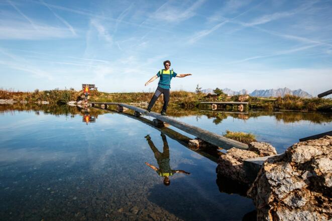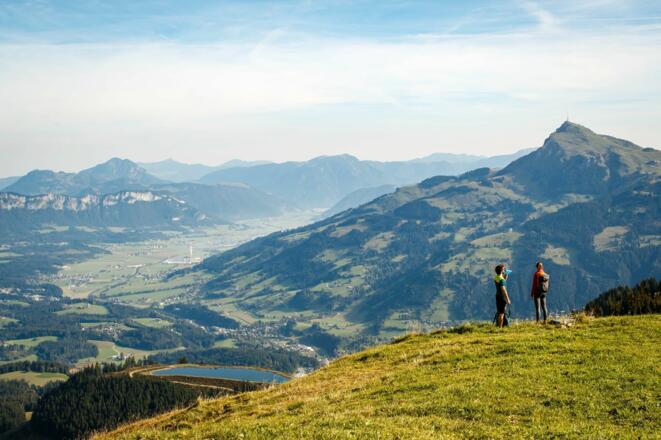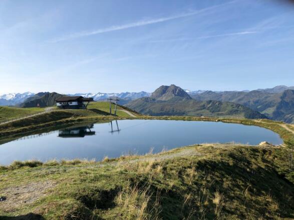 Oben orientiert man sich am Ehrenbachhöhensee und wandert hinter dem See ein kurzes Stück durch die Wiese abwärts auf die Bernhardkapelle zu. Nun auf dem Forstweg weiter hinüber zur nahe gelegenen Hahnenkammbahn (1.668 m; 45 min ab Ehrenbachhöhe). Hier besteht die Möglichkeit, die Route abzukürzen und mit der Gondel direkt nach Kitzbühel hinunterzufahren.