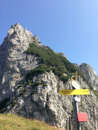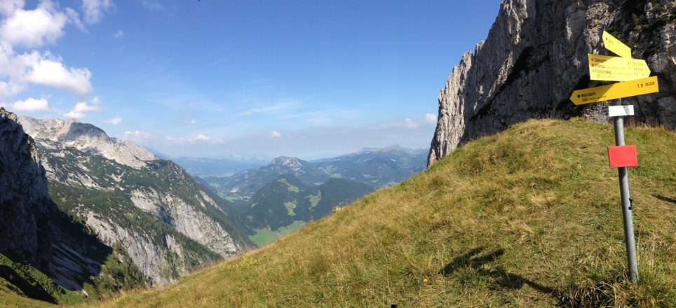 Der kürzeste Weg zum Ausgangspunkt führt über die Variante 27b den Fristabstieg hinunter zur Wandalm, wo man bereits zu Beginn der Wanderung war. Beim Abstieg ist hier besondere Vorsicht geboten.