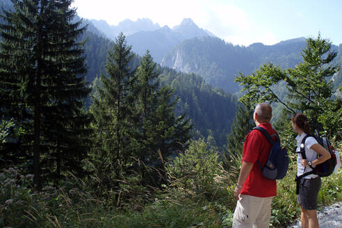 Am Ende des 3. Teiles, vor Beginn des schwierigsten Abschnittes, bietet ein schöner Ausblick Richtung Gartnerkofelmassiv und Kühweger Alm einen idealen Rastplatz.