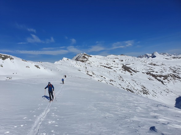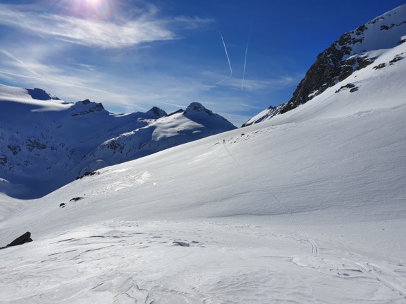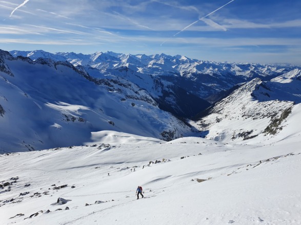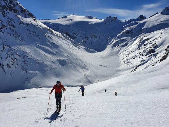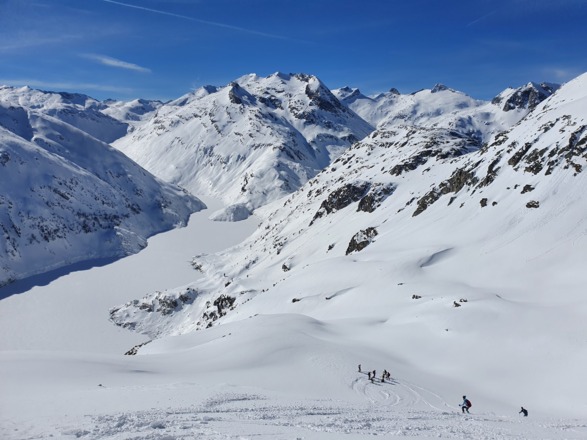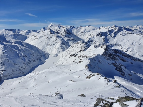 Am Gipfel des Weinschnabel könnte man die Tour noch abbrechen, indem man durch das Schödertal zurück zum Ausgangspunkt fährt. Bei guten Bedingungen hat man vom Weinschnabel südseitig eine eindrucksvolle Firnabfahrt hinunter zum Kölnbreinspeicher. Danach beginnt der schweißtreibende Anstieg Richtung Keeskogel. Zuerst noch recht mühsam entlang des Ufers des Kölnbreinspeichers (bei starker Erwärmung Achtung auf Rutsche vom steilen Südhang!) und dann rechtshaltend weiter durch das Kleinelendtal bis an die Südabbrüche des Keeskogels. Unterhalb der steilen Südflanke schwenkt man zunächst am besten links aus und steigt dann in einem weiten Rechtsbogen zum Sommerweg hinauf. Direkt unter den Felsen des Gipfelaufbaus findet man dann ein kleines Plateau, auf dem man recht gemütlich zur Kleineldenscharte hinüberqueren kann. Je nach Schneeverhältnissen und Schneemenge können sich die Verhältnisse beim Anstieg zur Kleinelendscharte aber schnell verändern. Bitte unbedingt schon vorweg weiter unten den besten Routenverlauf auschecken!