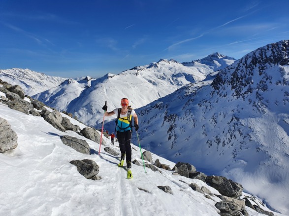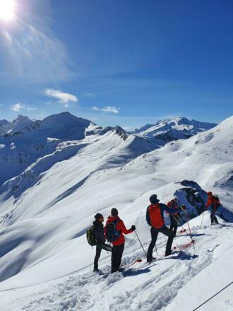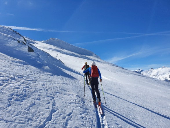 Von der Kleinelendscharte steigen wir nochmals 200 knackige Höhenmeter zum Keeskogel auf. Die letzten Meter am Grat legen wir zu Fuß zurück. Eventuell sind hier Steigeisen nötig.