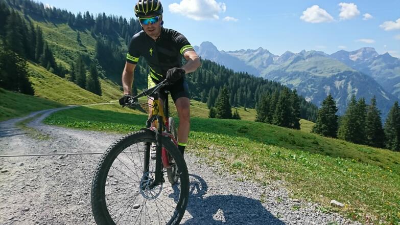Retour geht es auf dem gleichen Weg zur Mitteldiedamsalpe, dann dem Berghang entlang hinauf zur Breitenalpe. Es folgt ein Singletrail zur Neuhornbachalpe. Hier hat man zwei Möglichkeiten: Wer nicht gern auf Trails unterwegs ist fährt auf dem Forstweg ins Tal. Wer einen mittelschweren Trail absolvieren möchte biegt links ab zur Althornbachalpe. Der Singeltrail (S2) startet ca. 500m unterhalb der Althornbachalpe und endet bei der Pisialpe. Der Weg zurück nach Schoppernau verläuft auf einem Forstweg.