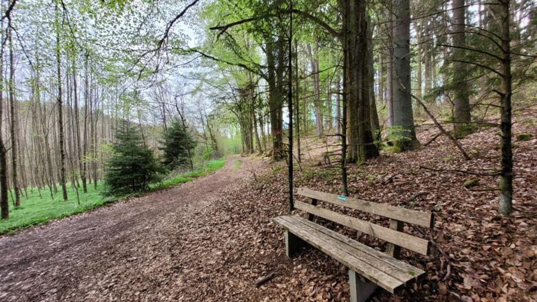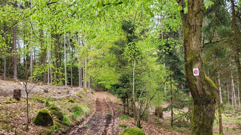 Die Wanderung beginnt in Saulburg am Friedhofsparkplatz. Die Naturpark Wanderkarte am Parkplatz bietet die Möglichkeit sich vorab den Rundweg einzuprägen oder bei Bedarf durch Scannen des QR-Codes die örtliche Wanderkarte direkt auf das Smartphone zu laden. Zunächst führt der Weg in Richtung Norden kurz durch die Wohnbebauung am Sonnenhang und über den St. Ägidiusweg sowie die Forstbergstraße in den Wald. Der buchenreiche Wald entlang des Weges mit alten Baumriesen und verhältnismäßig viel Totholz bietet einen idealen Lebensraum für Spechte und totholzbewohnende Käferarten, die auf der Wanderung zu hören oder sogar zu sehen sind.