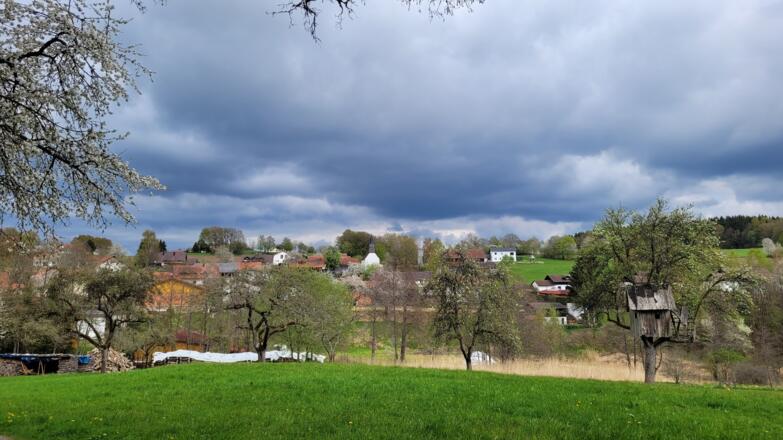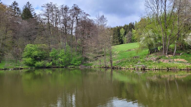 Danach führt der Weg vorbei am ehemaligen Damwild-Gehege am Vogelsang und überquert einen kleinen Zulauf des Auenzeller Baches, in dessen Umgebung mystische Baumriesen erhalten geblieben sind. Im Anschluss öffnet sich der Wald und gibt den Blick auf die idyllisch gelegene Ortschaft Auenzell frei. Zu entdecken sind dort außerdem mehrere Weiher an denen der Biber sein Unwesen treibt, blühende Streuobstflächen und nasse Wiesen mit Schilfbeständen.
