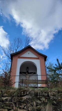 Danach führt der Weg kurz auf der ruhigen Straße durch die Ortschaft um im Anschluss entlang von blütenreichen Hecken und Streuobstwiesen in das Tal des Auenzeller Baches zu gelangen. Die Strecke des alten Auenzeller Kirchenwegs begleitet zunächst den Bach und führt nach einer Überquerung unterhalb des ehemaligen Wildgeheges in Richtung Süden. Bald trifft der Weg auf die etwas erhöht gelegene Kalvarienbergkapelle die zu einer Rast einlädt. Danach führt der Weg kurz auf geteerten Straßen über den Schlossberg zurück zum Ausgangspunkt.