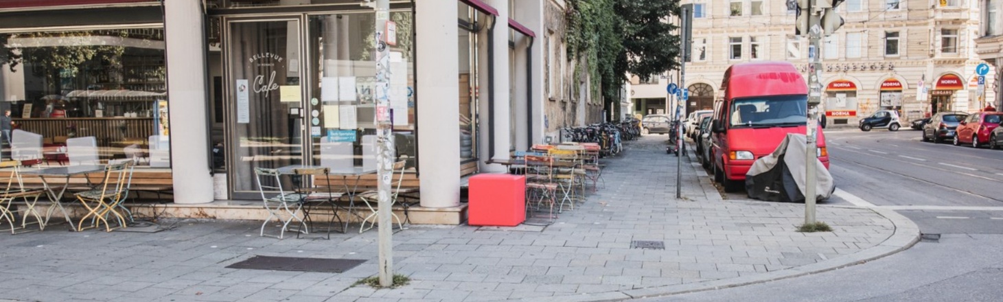 Café an der Ecke Müller-/Corneliusstraße. Der Cafébetrieb wird meist zusammen mit Geflüchteten organisiert und umgesetzt und ist darüber hinaus ein Teil des Sozialprojekts Bellevue di Monaco.