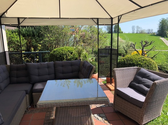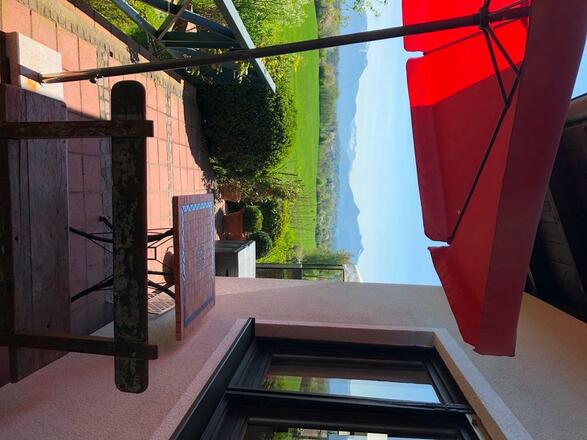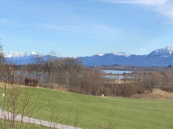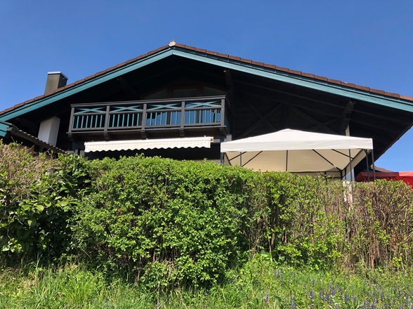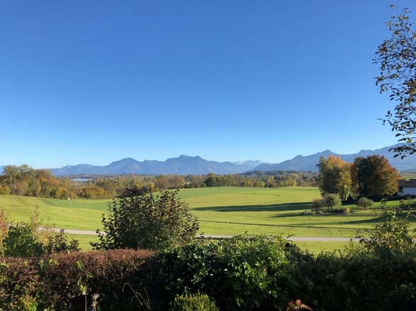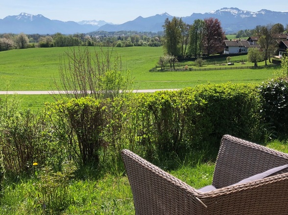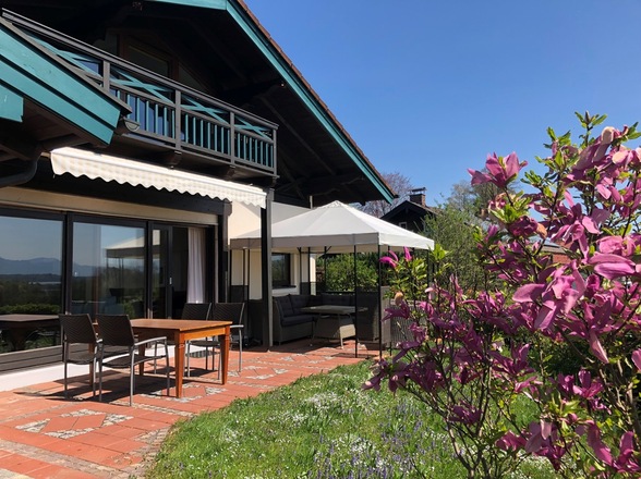 Haus in Ortsrandlage mit freiem Blick auf die Chiemgauer Alpen und dem Chiemsee (Seenähe). Wohnung mit gehobener, geschmackvoller Möblierung. Erdgeschoss 98 qm mit Esszimmer (48 qm). Große Fensterfront, Kaminofen, voll ausgestattete Küche, Schlafzimmer mit Boxspringbett, Duschbad mit Infrarotkabine. Bei Belegung mit mehr als zwei Personen plus Dachgeschoss-Studio (10 x 4 m) über Wendeltreppe erreichbar. Sitzgruppe, großer TV, Balkon mit einzigartigen Fernblick.