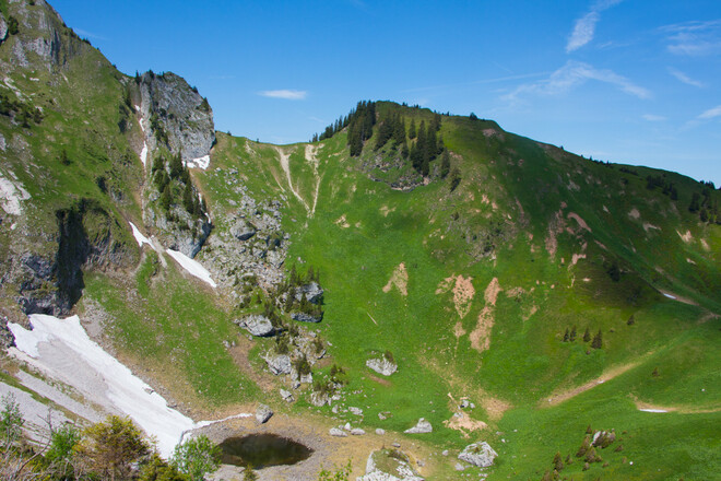 Nach einem kürzeren Anstieg erreichen Sie den Rand der Kesselwand. Ihr Blicke schweifen über einen riesigen Kessel, ähnlich einem Vulkankrater. Meist bildet sich hier im Sommer oder bei genügend Niederschlag ein kleiner See.
