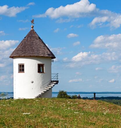 Planen Sie eine Fotostopp am Berghamer Wasserturm und genießen Sie das Grün, den Ausblick auf den Chiemsee und die Chiemgauer Alpen.