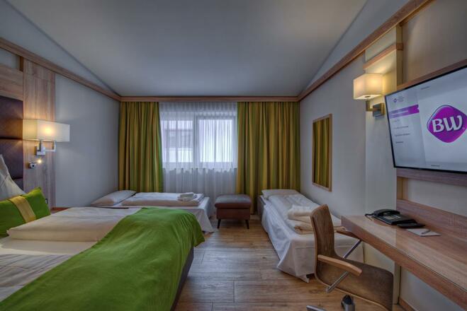 Ihr Urlaubsziel in Füssen - der Stadt König Ludwig II. Pur Romantik zwischen atemberaubenden Berggipfeln und unberührten Bergseen mit Kultur und königlichen Denkmälern. Der Ferien- und Kurort Füssen liegt am südlichen Ende der "Romantischen Staße" und ist eine der schönsten Ferienregionen Europas. Genießen Sie die Region in der Könige einst Urlaub machten. Das Best Western Plus Hotel Füssen ist ein Nichtraucherhotel mit 88 Zimmer und liegt nur 300 m von der historischen Innenstadt, 500 m zum Bahnhof / Busbahnhof und 4 km von dem weltberühmten Schloss Neuschwanstein entfernt. Alle Zimmer verfügen über Dusche/WC, Kosmetikspiegel, Direktwahltelefon, Internet und Minibar. In unserem Restaurant mit 120 Sitzplätzen können sie sich mit unserer mediterranen / deutschen Küche verwöhnen lassen. Den Abend lassen Sie an unserer Hotelbar mit einem Cocktail oder Longdrink ausklingen.SonstigesFrühstück 9,50 € p. P.; Tiefgarage 7,00 € p. Tag; Haustiere 10,00 € p. Tag (ohne Futter);