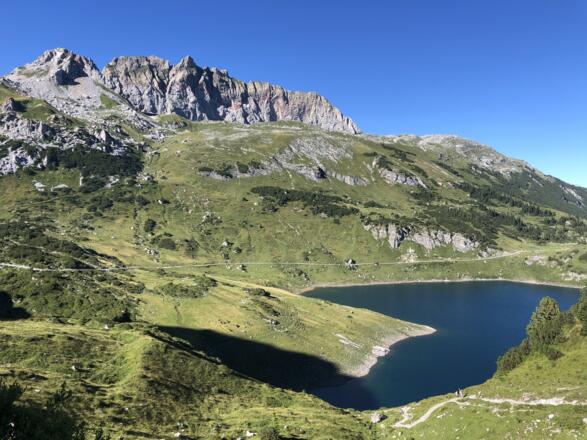 Bike: Mit dem Bike von Lech nach Zug und weiter auf der asphaltierten Straße vorbei am Gasthaus Älpele zum Formarinsee und weiter auf dem Schotterweg zur Freiburger Hütte.