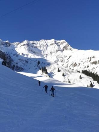 Bei schwierigen Verhältnissen kann circa ab der Hälfte auf den deutlich leichteren Hochberg gewechselt werden. Hier bietet sich eine sehr lohnende Abfahrt nach Landsteg an.
