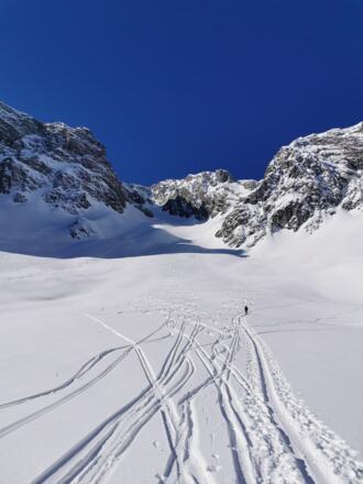 Im unteren Bereich sind steile Hänge zu queren. Im oberen Bereich extrem steil!