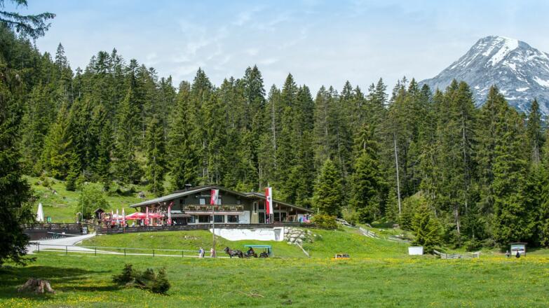 Hat man sich am atemberaubenden Bergblick satt gesehen, führen von der Plattform kleine Treppenstufen Richtung Wildmoosalm (Weg Nr. 62) - das Steilstück bitte entsprechend vorsichtig absteigen. An der nächsten Weggabelung links ab zur Wildmoosalm (Weg Nr. 63) und dort eine verdiente Verschnaufpause genießen. Seine Schmankerln serviert der herzliche Hüttenwirt auf der gemütlichen Sonnenterrasse übrigens besonders gern mit einem flotten Spruch.