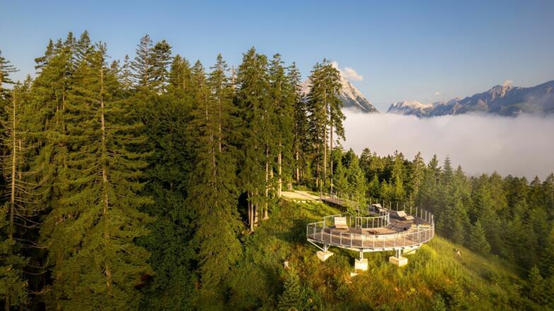 Dem Waldweg geradeaus folgend, trifft man auf den Rundwanderweg um den Brunschkopf (Weg Nr. 60). An der Weggabelung dann rechts der Beschilderung Brunschkopf/Wildmoosalm/Seefeld folgen und bei der nächsten Möglichkeit links auf den Wandersteig (Weg Nr. 61 Brunschkopf) abzweigen. Diesem Steig nun immer weiter folgen - wo die Forststraße den Steig kreuzt, bitte besonders auf Biker achten. Am Aussichts- und Fotospot Hohe Munde empfiehlt sich außerdem noch ein schönes Erinnerungsfoto, wenig weiter hat man auch schon die Aussichtsplattform Brunschkopf erreicht. Das atemberaubende Bergpanorama kann man hier mithilfe eines hochkarätigen Swarovski-Fernglases übrigens besonders kristallklar genießen.