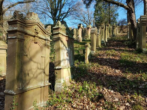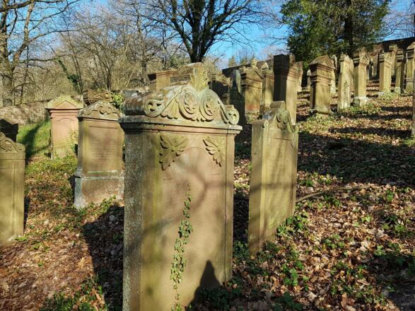 Die nächste Station ist auf dem gegenüberliegenden Hang der Jüdische Regionalfriedhof mit seiner ganz besonderen Atmosphäre. Zutritt und Führungen können über die Gemeindeverwaltung organisiert werden, aber schon die Infotafel gibt umfangreiche Einblicke.