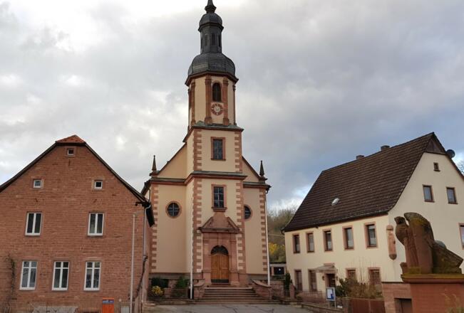Die Hauptstraße entlang erreichen Sie den 2021 umgestalteten Kirchplatz, an dem Schul-, Pfarr- und Rathaus, dominiert von der Pfarrkirche und ergänzt durch Brunnen, Kriegerdenkmal und Säulenbildstöcke ein geschlossenes Ensemble bilden. Informationstafeln präsentieren Wissenswertes über die Kirche, Platz und Ensemble.