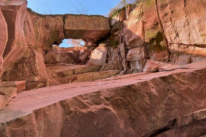 Dieser Wegabschnitt bietet eine Fülle an unterschiedlichen Eindrücken: Steinbrüche, Landschaftspanoramen, Bauten, Meisterstücke der Steinmetze und Bildhauer, Museum und die Ausstellung zu Geschichte(n) des Buntsandsteins. Anspruchsvolle Wegpassagen erfordern gutes Schuhwerk und Grundkondition.