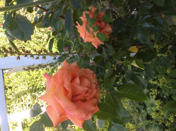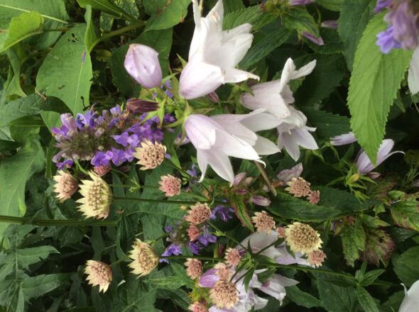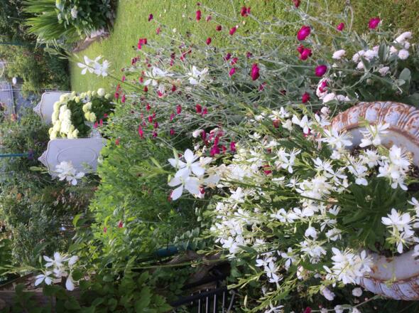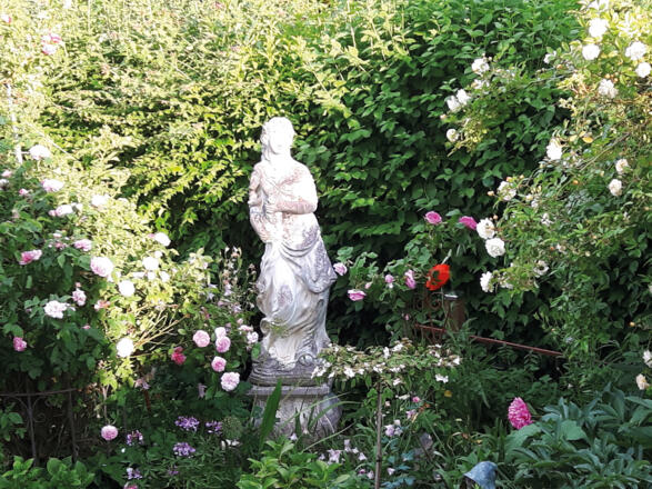 Bereits am Eingang des Gartens eröffnet sich ein Traum von einer Rosenpracht, die mit Clematis und Begleitstauden eine wunderbare Symbiose bilden. Gartenräume entstehen durch alte Zäune und Rankgerüste und umspielen dabei großzügig angelegte Staudenbeete. So wirkt der ca. 1.000 m2 große Garten sehr harmonisch.