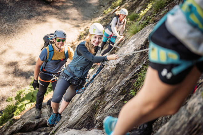 - Empfohlenes Mindestalter 12 Jahre – es befinden sich mehrere Kletterstellen mit der Schwierigkeit C (Skala von A bis F) sowie eine ausgesetzte Seilbrücke am Steig.