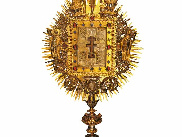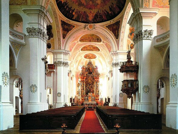 Imposante Klosteranlage mit spätbarocker Wallfahrtskirche in prachtvoller Stuckausstattung im Wessobrunner Stil von Franz Schmuzer. Wallfahrtsstätte aufgrund der in der Gruftkapelle aufbewahrten Original-Kreuzpartikel,