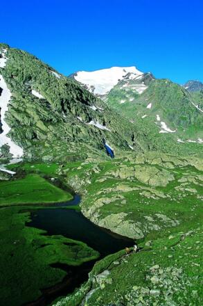 Es folgt ein langer, serpentinenreicher Abstieg mit einzelnen gesicherten Passagen bis zum Fuße eines Gletscherbaches. Nicht mehr weit von der Nürnberger Hütte entfernt, folgt noch ein kurzer Anstieg. Die letzten Meter sind sehr flach und somit leicht begehbar.