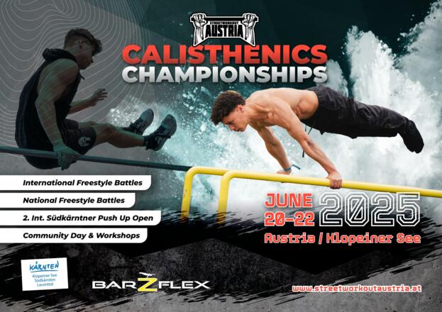 Erlebe die internationale & nationale Championship im Freestyle Calisthenics, die offizielle österr. Staatsmeisterschaft, die Push-Up Open Liegestütze-Meisterschaft und einen einzigartigen Community Day. Die stärksten Athlet:innen aus Österreich und der ganzen Welt treten im packenden 1vs1 K.O.-Format gegeneinander an – begleitet von mitreißendem Sound. Erstmals wird neben dem österreichischen Titel auch der internationale Champion gekrönt. Sei dabei, wenn die besten Calisthenics-Athlet:innen ihre spektakulärsten Moves präsentieren!
