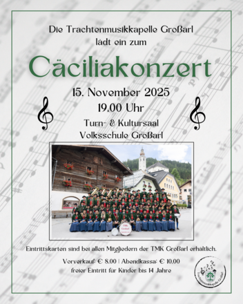 Die Trachtenmusikkapelle Großarl lädt Sie sehr herzlich zum Cäciliakonzert 2025 ein. Es erwartet Sie ein abwechslungsreiches Programm mit verschiedenen musikalischen Highlights. Eintritt: € 8,00 VVK | € 10,00 Abendkassa. Freier Eintritt für Kinder bis 14 Jahre. Eintrittskarten sind bei allen Mitgliedern der Musikkapelle erhältlich.