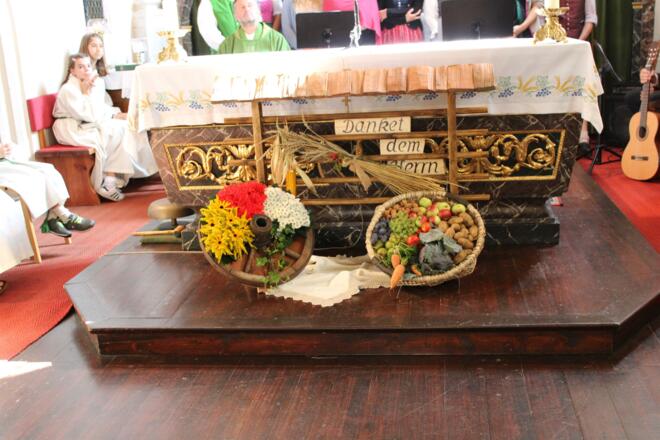 In den Pfarren wird das Erntedankfest zu unterschiedlichen Zeiten begannen, meist zwischen Ende September und Ende Oktober an einem Sonntag im Rahmen des Gottesdienstes mit anschließender Prozession und Feier. Es soll nicht nur Dank gezeigt, sondern auch daran erinnert werden, dass es nicht allein in der Hand des Menschen liegt, über ausreichend Nahrung zu verfügen.