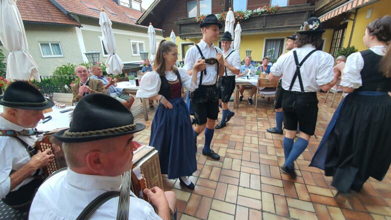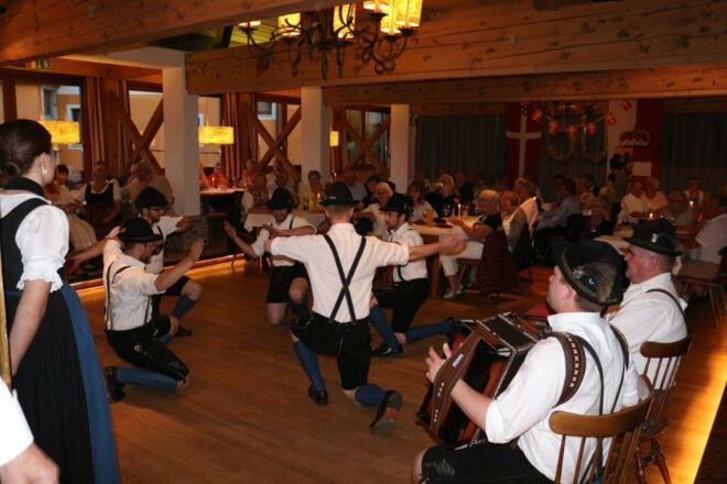 Dazu hören Sie Volkslieder aus der Region und tanzen zur alpenländischen Live-Volksmusik.