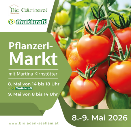 Pflanzerlmarkt mit Gemüsepflanzen. Martina Kirnstötter, bekannt vom Seehamer Blütenfest, kommt mit Ihren Schätzen aus der Bio-Raritäten-Gärtnerei aus Handenberg in den Bioladen Seeham. Am Freitag ist zudem die Oberösterreichische Firma Multikraft – natürliche Lösungen mit probiotischer Kraft für Garten, Haushalt, Wohlbefinden und Landwirtschaft – zu Gast im Bioladen.
