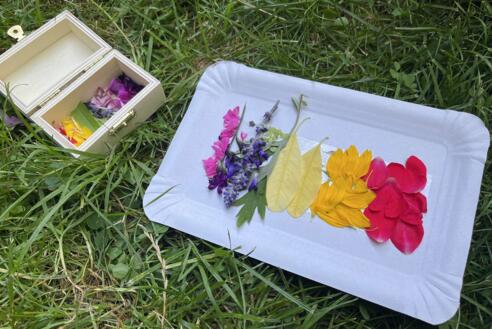 Mit gesammelten Blüten und Blättern versuchen wir zu malen und zu färben und wir gestalten kleine bunte Kunstwerke. Außerdem lassen wir uns die selbstgemachten Blumenbrote schmecken. Ferienprogramm für Kinder ab 6 J.