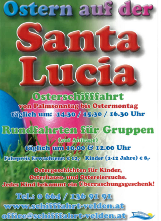 Exklusive Osterschifffahrten für Gruppen unter Voranmeldung sind möglich unter +43 664 1369191 oder per Mail an office@schifffahrt-velden.at