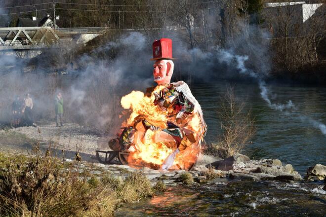 Die Fetzenfigur, die den Ebenseer Fasching symbolisiert, wird unter Trauermusik zum Traunufer getragen und dort verbrannt.