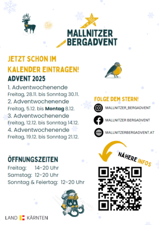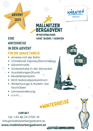 An den Adventwochenenden im Dezember erwartet Sie in Mallnitz nicht nur ein stimmungsvoller Adventweg, sondern auch ein buntes Kinderprogramm. Hier würde das Christkind Urlaub machen - eine bewußte Gegenweld zum hektischen vorweihnachtlichen Treiben in den Städten. Erleben Sie die verschneite Bergwelt, lauschen sie den schönsten Adventliedern und lassen Sie sich von besinnlichen Erzählungen in der Almstube verzaubern.