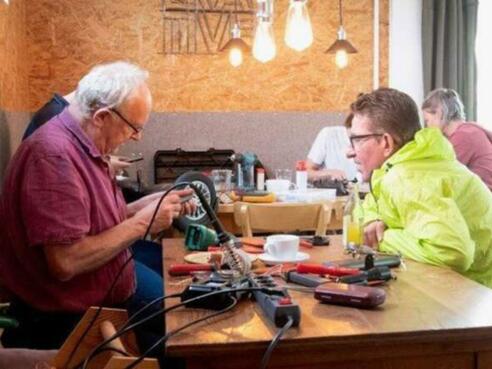 Jung und Alt sitzen beisammen und reparieren, plaudern, philosophieren, trinken Kaffee…