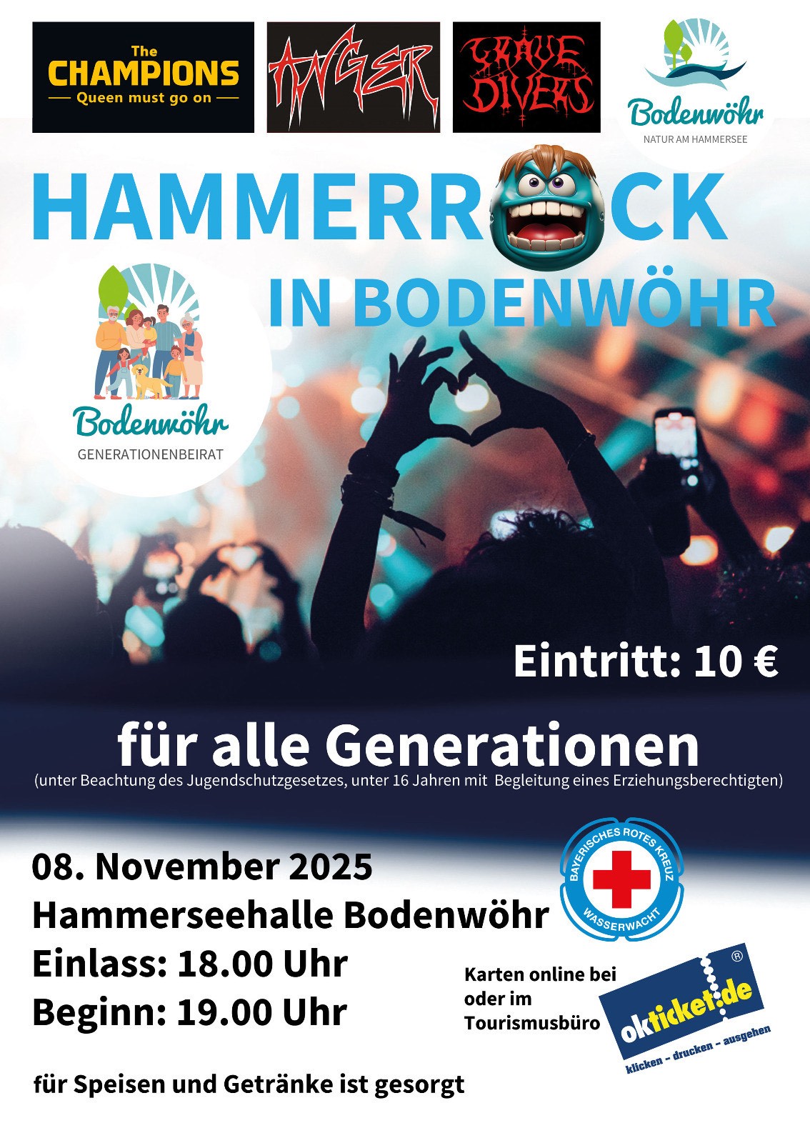 Hammerrock 3.0, das große Benefizkonzert in Bodenwöhr, startet am 8. November in der Hammerseehalle! Willkommen sind Menschen in jedem Alter, alle Generationen werden bis nach Mitternacht viel Spaß haben (unter 16 Jahren mit Begleitung eines Erziehungsberechtigten) und tanzen! Für einige Überraschungen ist gesorgt! Bodenwöhrer Vereine bieten Getränke und Essen, und im Foyer befindet sich ein Cocktailstand. Der Erlös kommt den Vereinen zugute, ein eventueller Überschuss wird gespendet. Ein Drittel der Halle ist bestuhlt. Einlass ist ab 18 Uhr, Beginn ab 19 Uhr. Ran an die Karten!