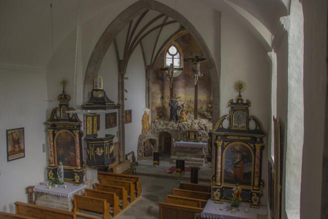 Die ca. 1395 kleine, spätgotische Filialkirche mit seinem zwiebelförmigen Türmchen ist bekannt wegen seines Hochaltares. Dieser ist gebaut auf Grotten- und Sandstein und wurde um 1712 mit der Kalvarienbergszene verschönert.