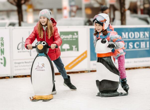 Vom Bad Schallerbacher Winterdorf nicht wegzudenken und Highlight für die kleinsten Besucher/-innen ist die 200 Quadratmeter große, klimafreundliche Kunsteisfläche, die mitten auf dem Rathausplatz für unbeschwerten Eislaufspaß sorgt. Dank 58 regionaler Sponsorpartner zählt die Eisfläche zum fixen Bestandteil des Winterdorfes. Für diejenigen, die spontan eine Runde drehen wollen, stehen direkt vor Ort Eislaufschuhe in unterschiedlichen Größen und Kufen zum kostenlosen Verleih zur Verfügung. Die lustigen Eislaufhilfen in Form von Pinguin und Eisbär unterstützen bei den ersten Schritten auf der Kunsteisfläche, sodass einem unbeschwerten Eislaufvergnügen nichts im Wege steht.