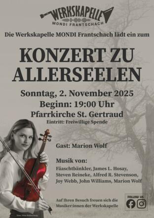 Am Sonntag, 02.11.2025 laden die Musiker:innen der Werkskapelle Mondi Frantschach mit Beginn um 19:00 Uhr zu ihrem traditionellen Konzert zu Allerseelen in die Pfarrkirche St. Gertraud ein.