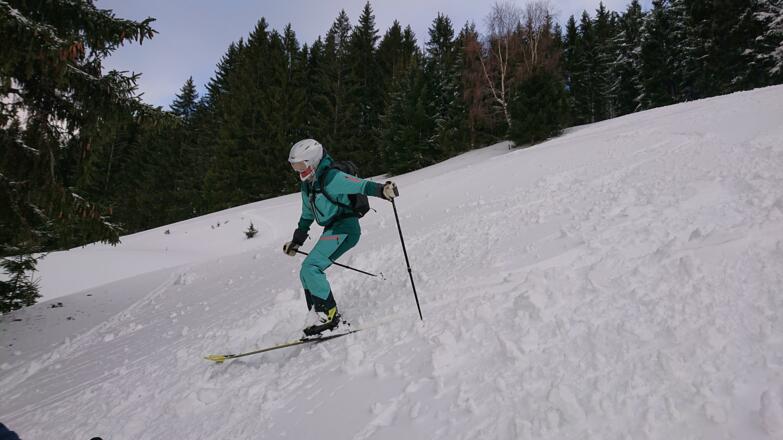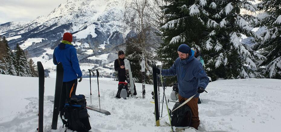 Sicherheitsausrüstung (Skitourenrucksack mit Erste-Hilfe-Set, Verschütteten-Suchgerät, Lawinen-Sonde und -Schaufel) wird vor Ort kostenlos zur Verfügung gestellt.