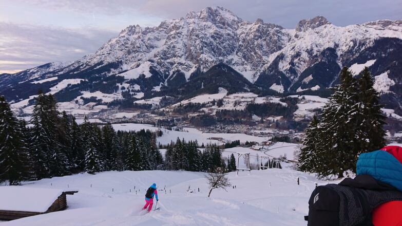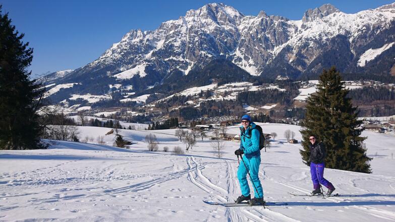 Die benötigte Skitourenausrüstung (Tourenskischuhe, Tourenski mit Klebefelle, Teleskopskistöcke) kann im lokalen Sporthandel ausgeliehen werden. ...in Saalfelden https://www.sport2000rent.com/skiverleih/haendler/sport-2000-simon, ...in Leogang https://www.sport2000rent.com/skiverleih/haendler/sport-mitterer