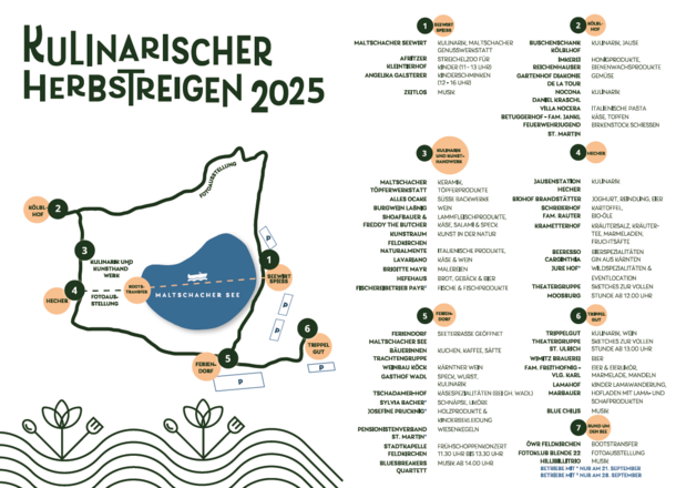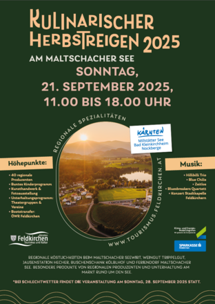Am Sonntag, dem 20. September 2026, lädt das Tourismusreferat der Stadtgemeinde Feldkirchen gemeinsam mit den Betrieben rund um den Maltschacher See von 11 bis 18 Uhr zum mittlerweile fünften Kulinarischen Herbstreigen ein.