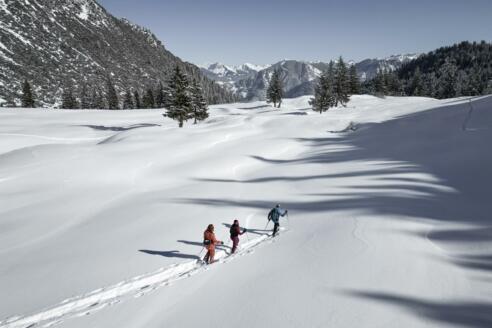 Je nach Schneelage und Lawinensituation führt die ganztägige Tour zu unteren Brüggele Alpe oder aufs Amatschonjoch.