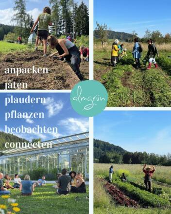 Gemeinsam anpacken, jäten, plaudern, pflanzen, beobachten, connecten am almgrün Gemüseacker in Steinfelden
