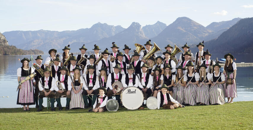Weckruf der Bürgermusik mit den örtlichen Vereinen beim Maibaum im Seepark in St. Gilgen.