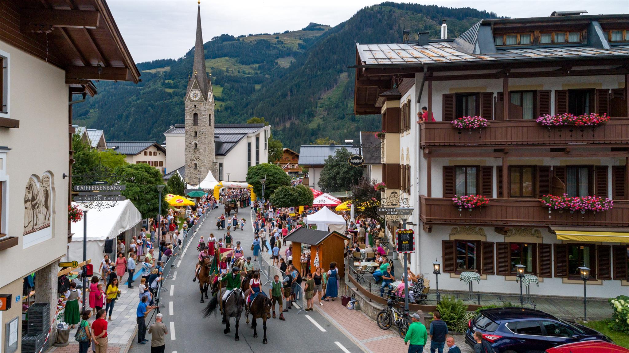 Großer Festumzug: Schnalzer, Trachtenmusikkapelle, Pferdegespanne, Trachtengruppe, Trachtenfrauen, Kindertraktoren, Oldtimertraktoren ...