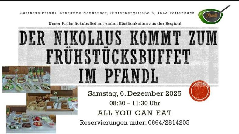 Herzliche Einldaung zum Frühstücksbuffet im Gasthaus Pfandl. Mit Besuch vom Nikolaus!