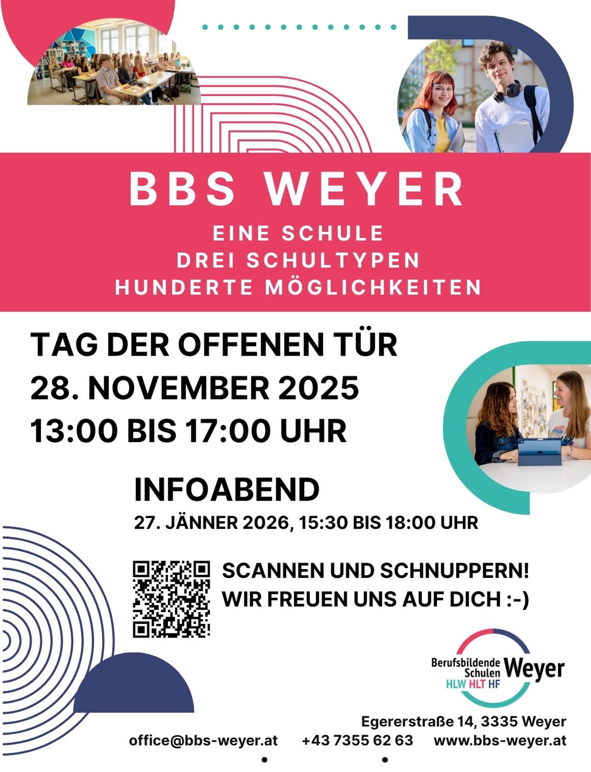 Und wenn du Lust hast, bei uns zu schnuppern, kannst du dich jederzeit bei uns melden – schreib einfach ein Mail an office@bbs-weyer.at oder melde dich direkt über unsere Homepage an. Anrufen kannst du uns unter 07355 6263. Oder du besuchst uns einfach am Tag der offenen Tür oder am Infoabend. Wenn du Teil unserer Community werden oder dich informieren willst, dann folge uns auf Social Media!
