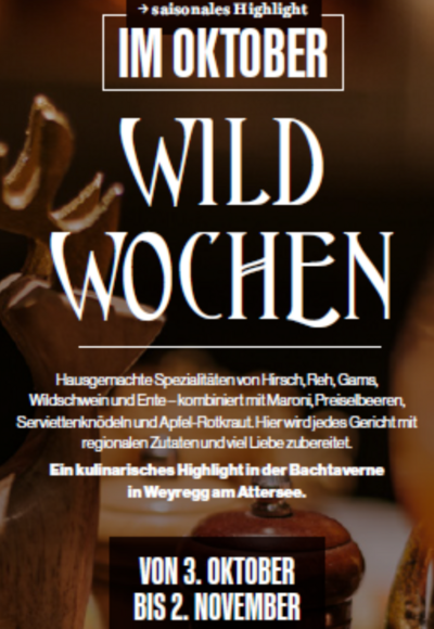 Wenn sich Blätter bunt verfärben und die Landschaft rund um den Attersee in ein außergewöhnliches Licht taucht, dann genießt dann genießen man köstlich zubereitete Wildgerichte in gemütlicher Atmosphäre in der Zenz´n Stub´n.